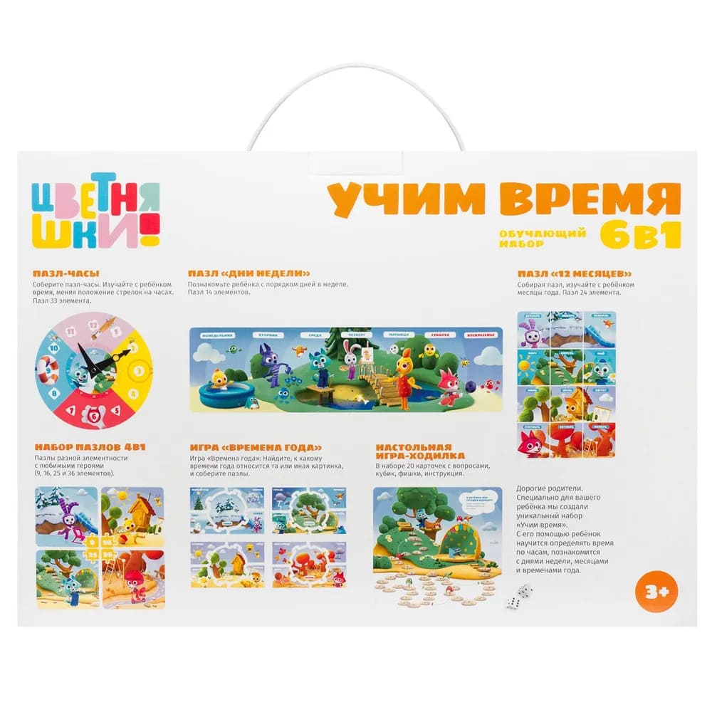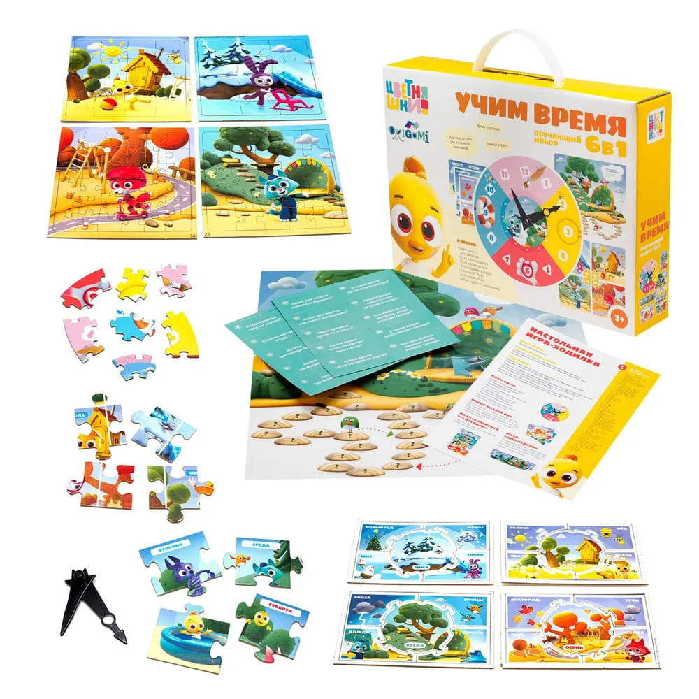 Производитель ОригамиИгровой набор «Учим время» - это увлекательная игра, которая поможет ребенку научиться определять время, запомнить дни недели и месяцы года. В наборе: пазл-часы (33 элемента), пазл 'дни недели' (14 элементов), пазл '12 месяцев' (24 элемента), игра 'времена года' (5 элементов), пазл 4в1 (9, 16, 25, 36 элементов), настольная игра-ходилка (20 карточек), фишки, кубик. Материалы: картон, бумага, полимерные материалы. Для детей от 1 года.